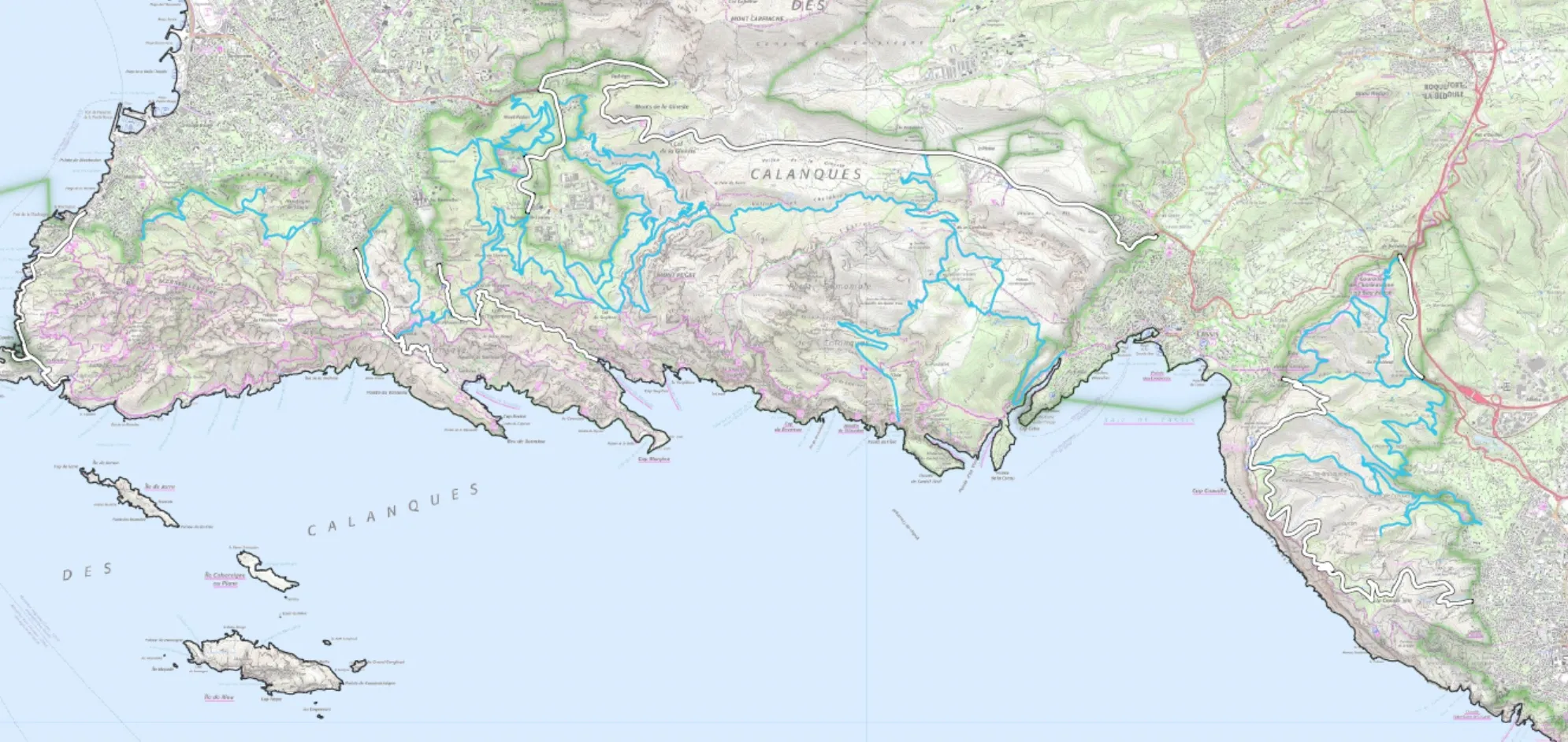 Vous disposez ci-dessous d'une carte montrant des chemins destinés à la pratique du Vélo dans le Parc National des Calanques (surlignés en bleu).